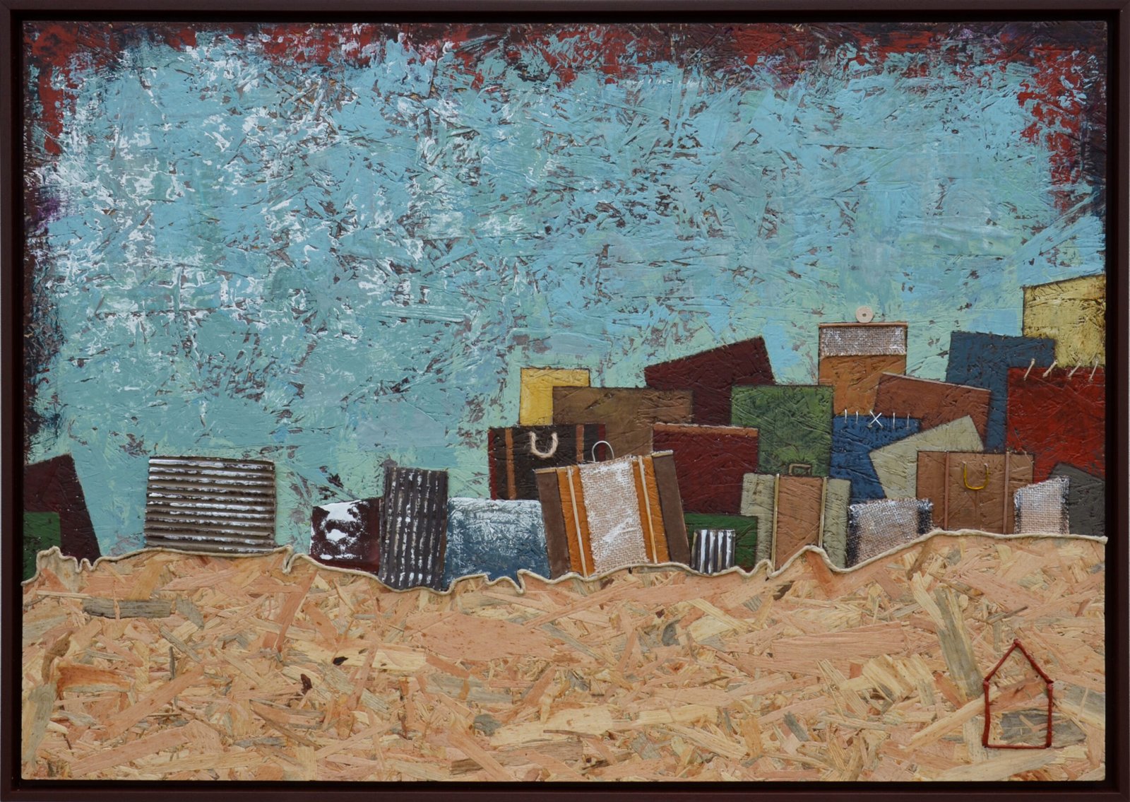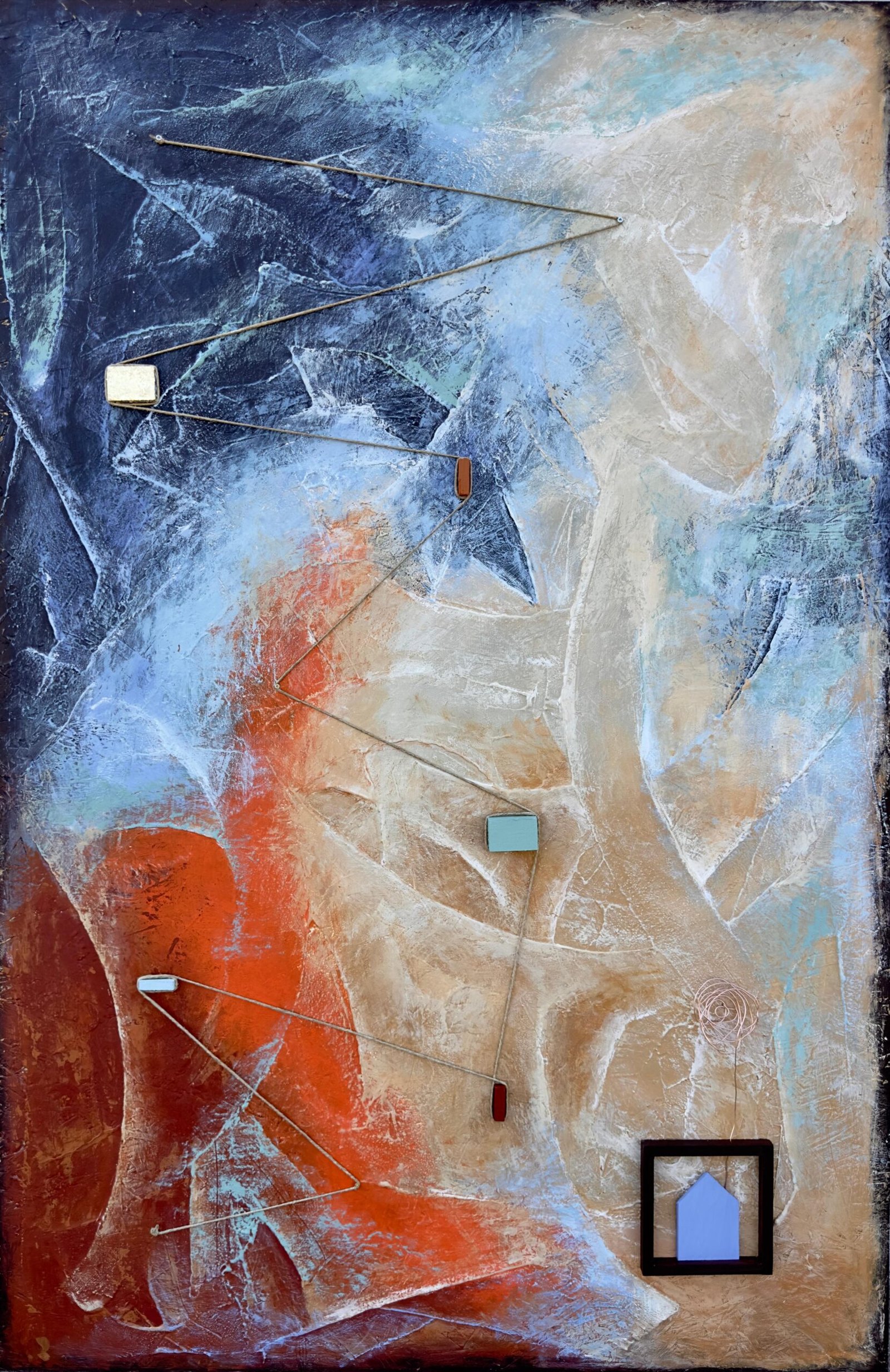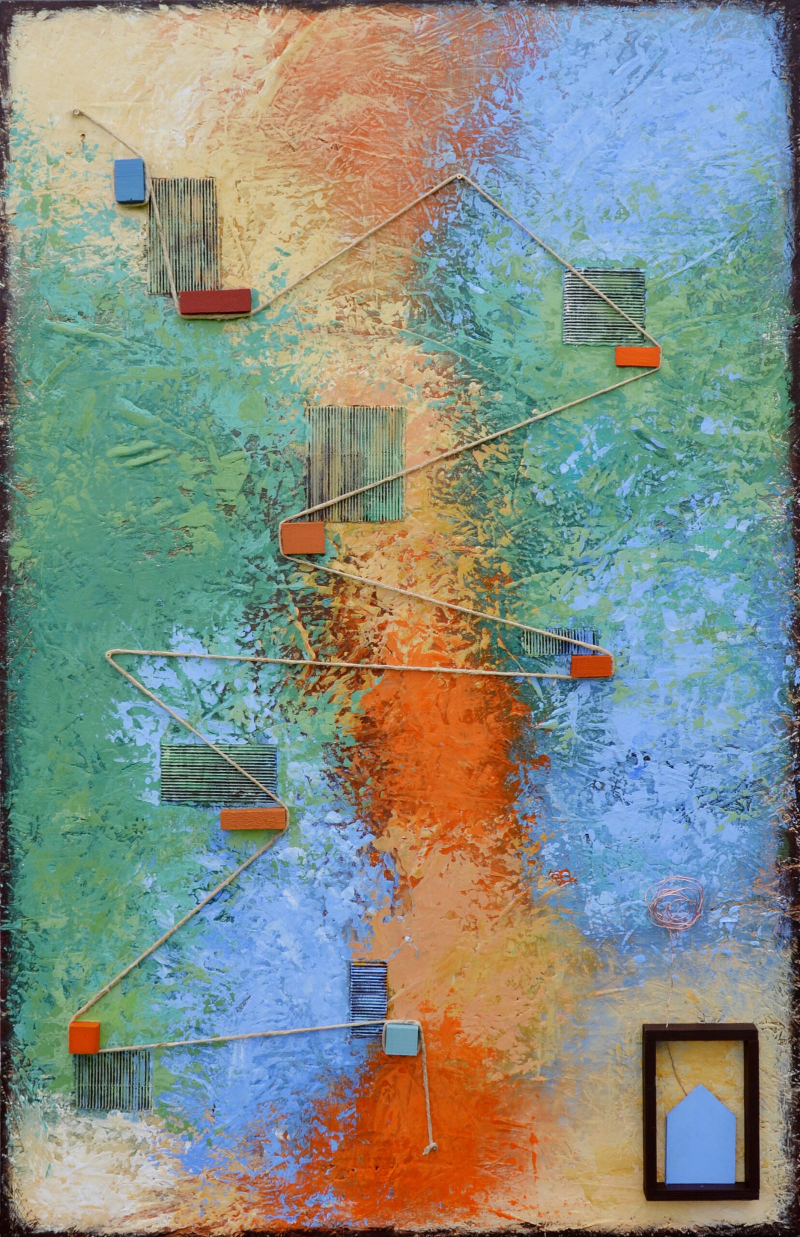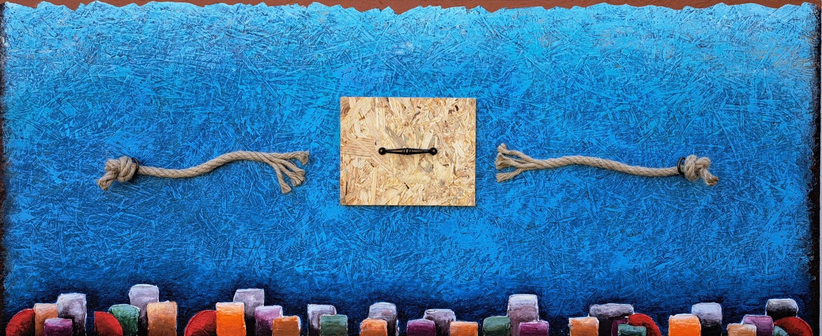 Acrilici, stucco, metallo, legno e corda su OSB