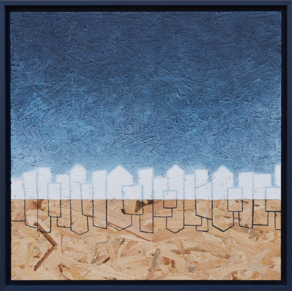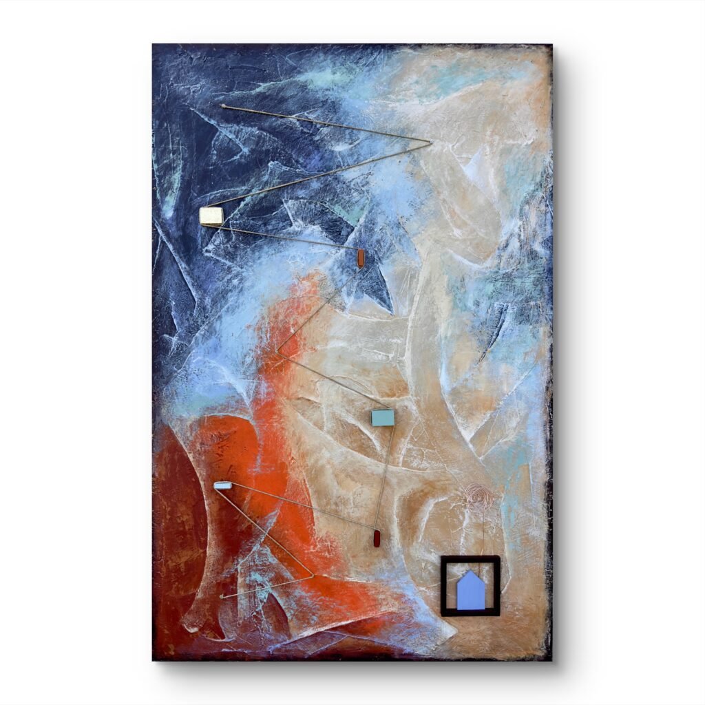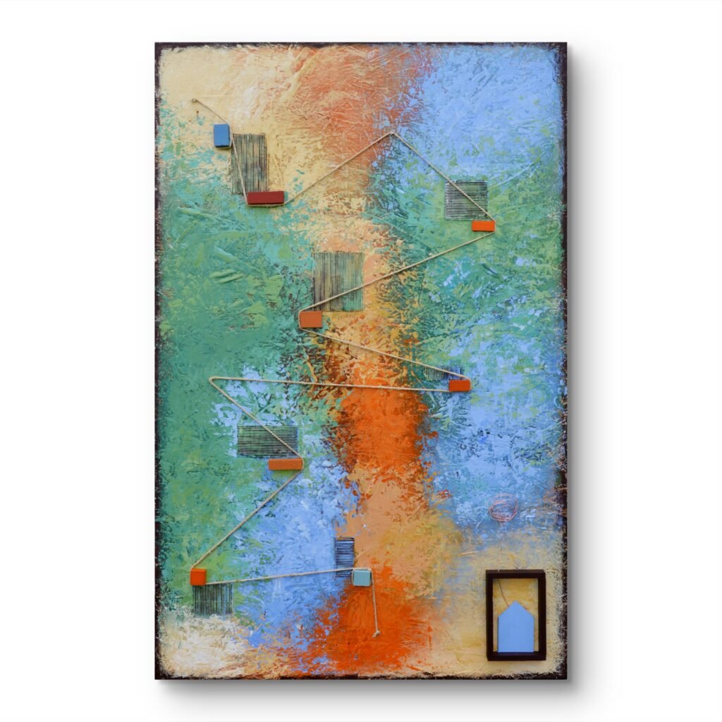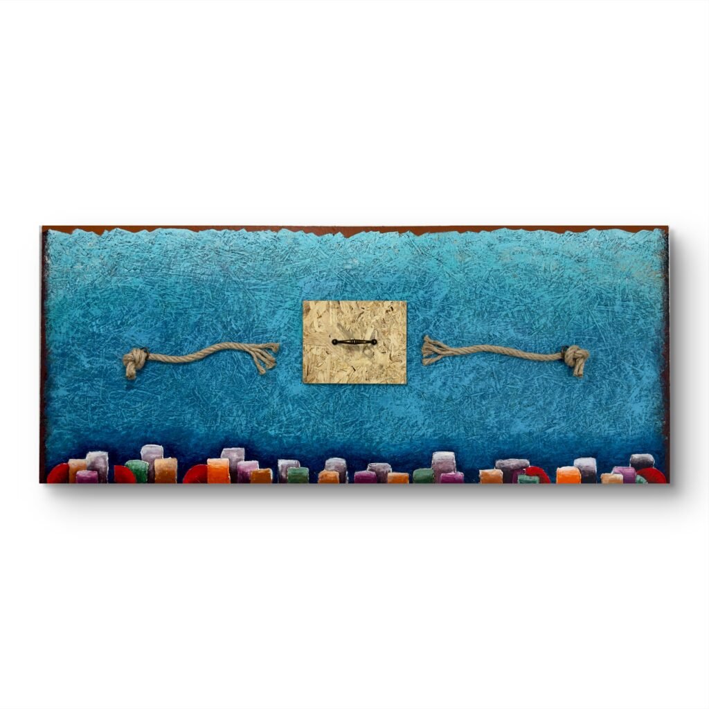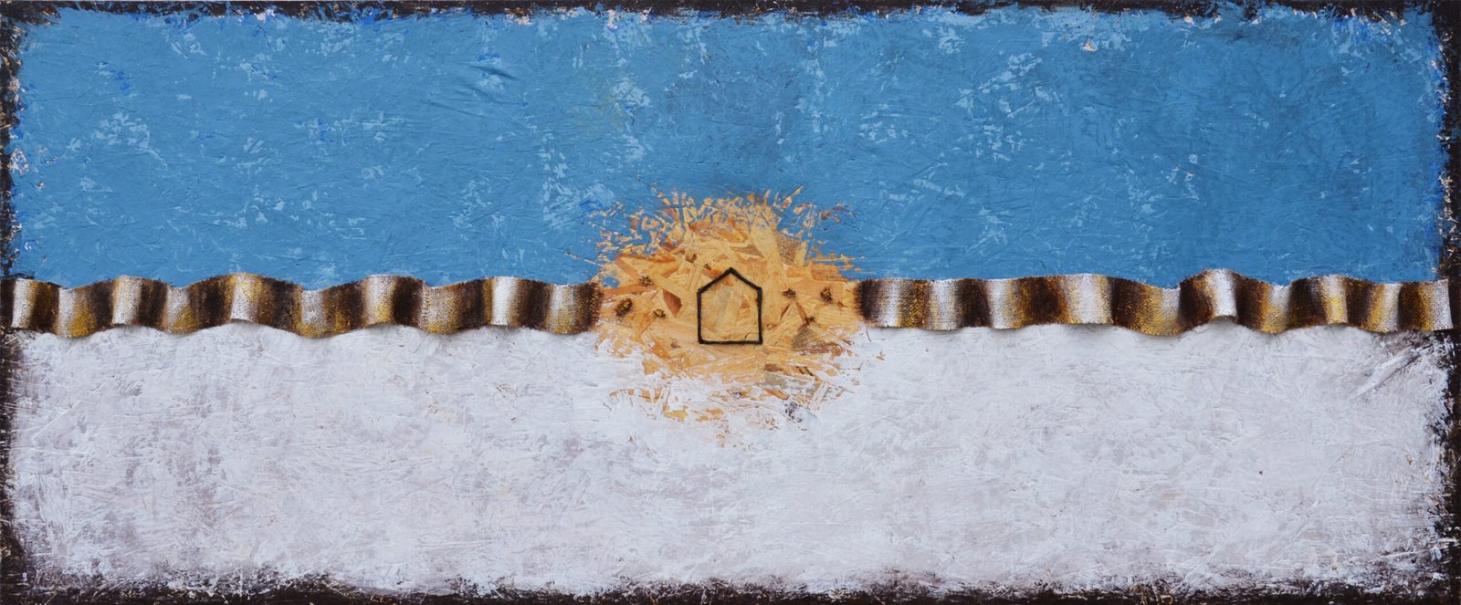 Acrilici, stucco, metallo, legno e corda su OSB