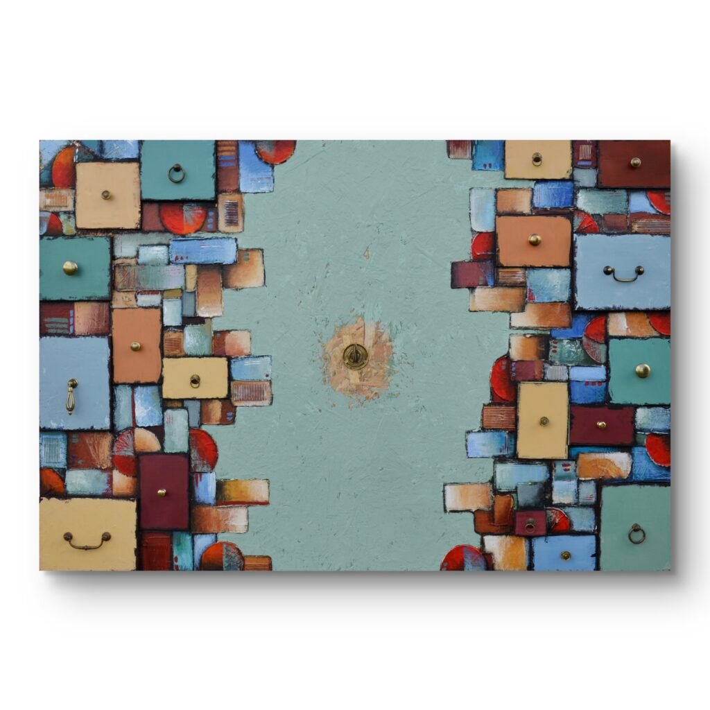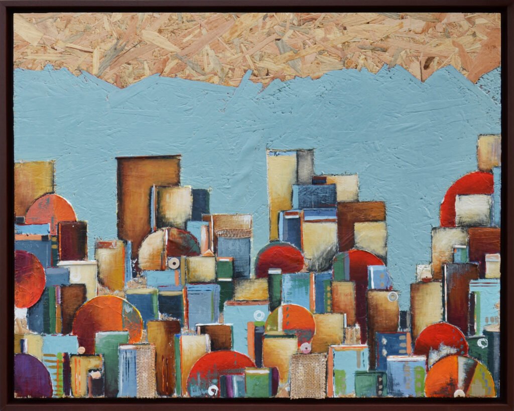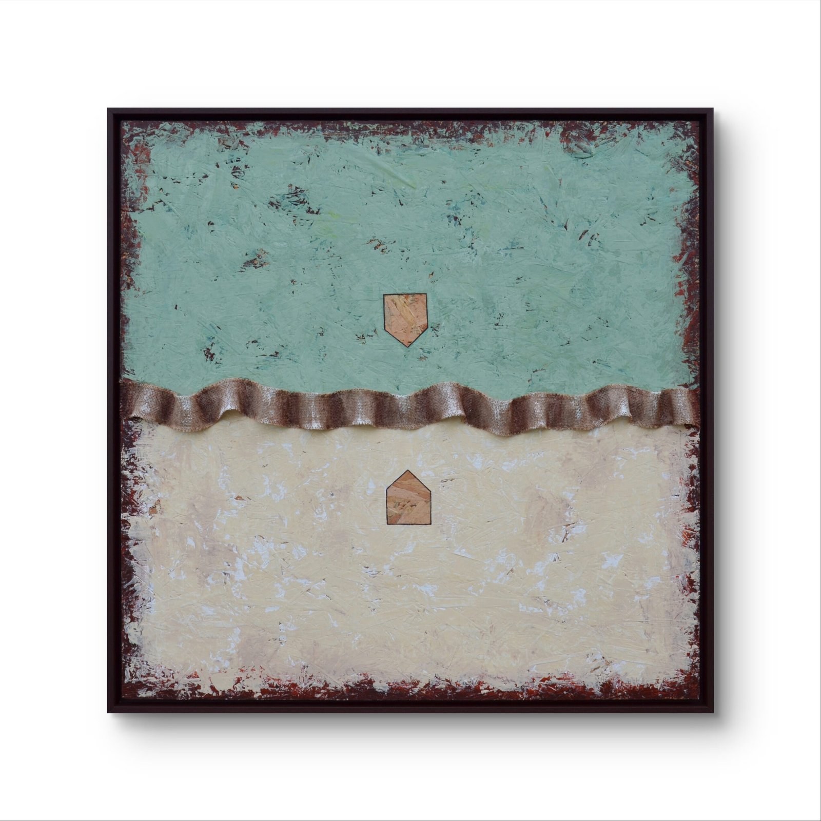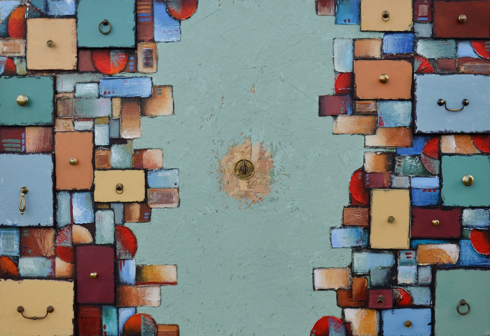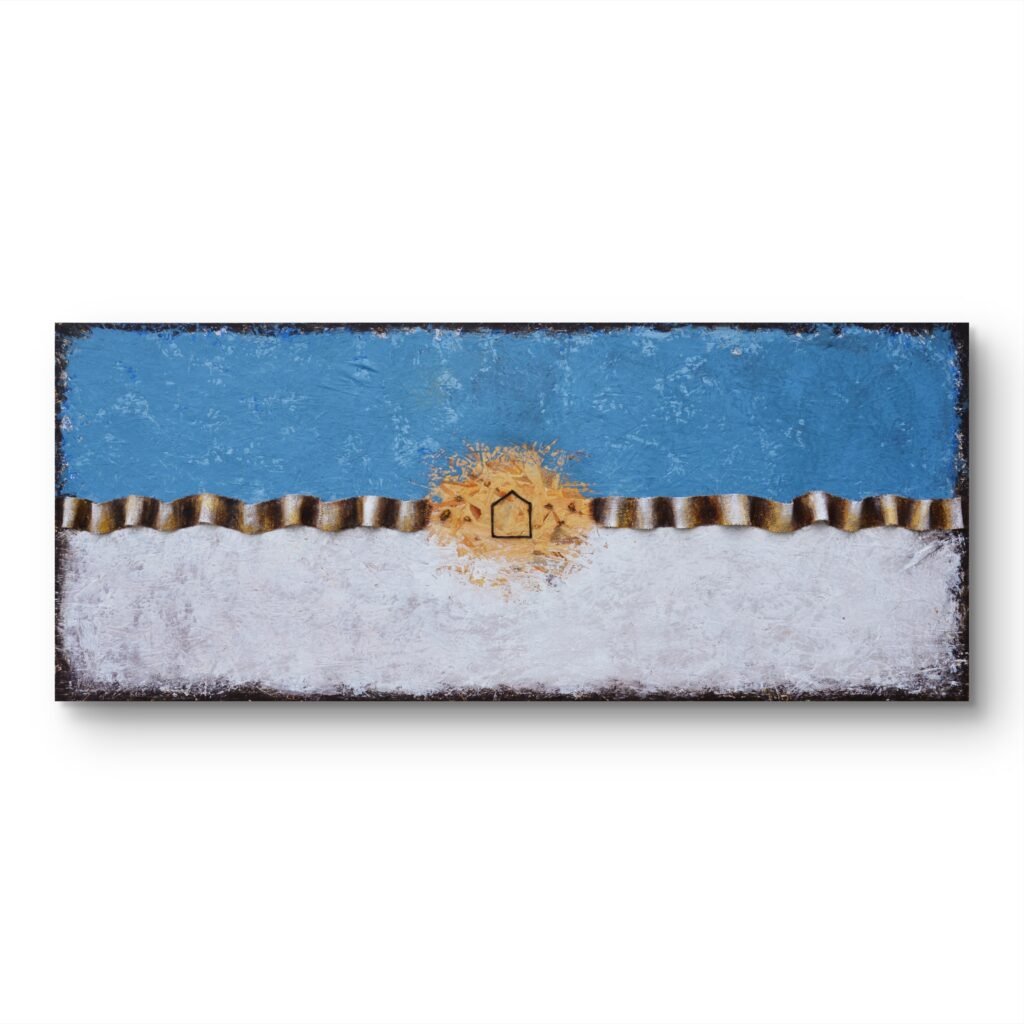 Acrilici, stucco, metallo, legno e corda su OSB